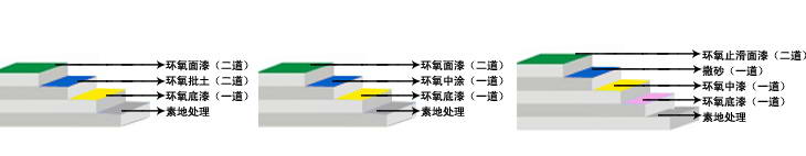 ②环氧透明底漆:采用渗透性及附着力特强的环氧透明底漆滚涂一道,增强对地面的附着力; ③环氧砂浆中涂:将环氧树脂加入适量的石英砂,用镘刀将其均匀涂布一道,增强地面的耐压及抗冲击性能; ④环氧面漆:用环氧面漆滚涂二道,使地面防尘防水,耐磨耐腐蚀; ⑤施工完成:完工后休整地面颜色均一、无气泡、无空鼓。 |